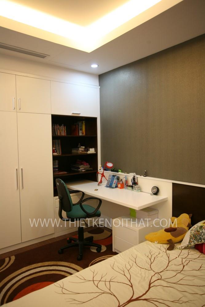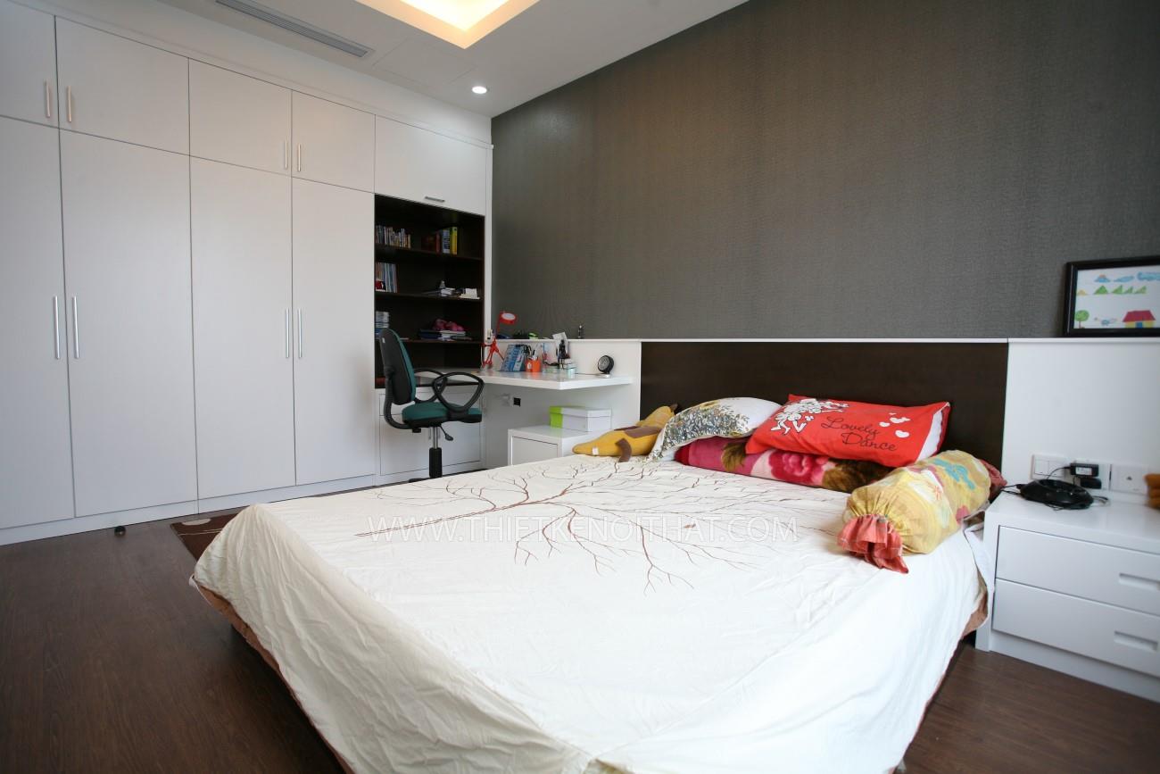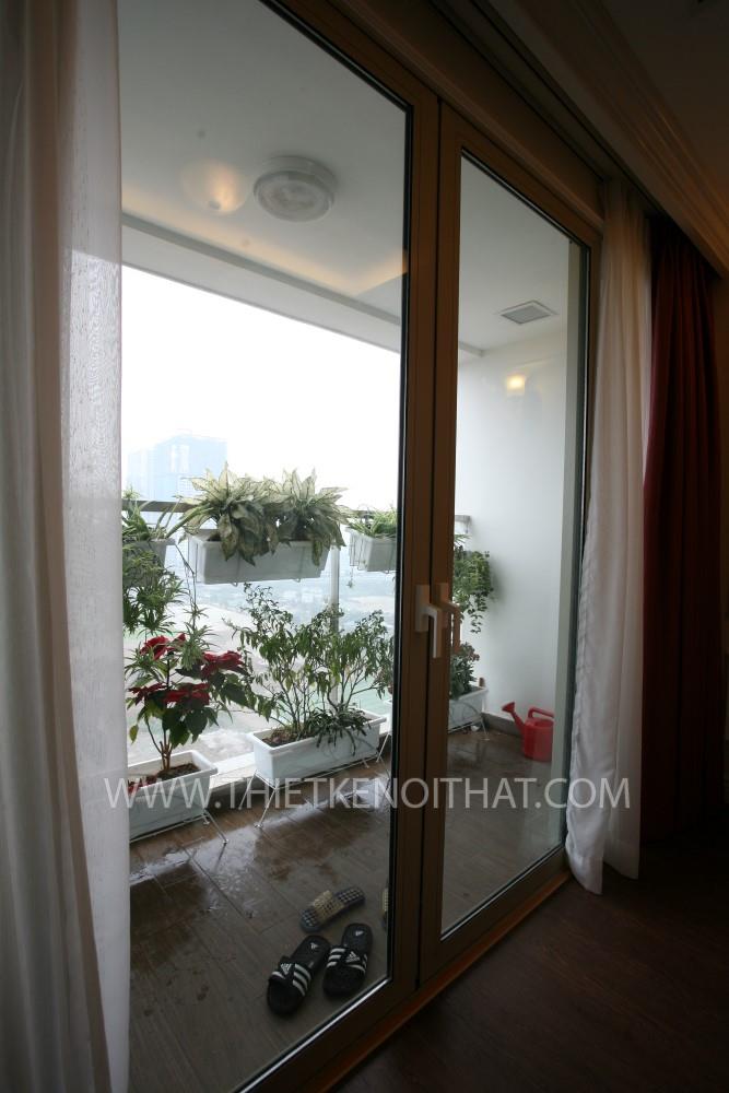 Tiếp theo là thiết kế nội thất phòng ngủ phong cách tân cổ điển. Trong quá trình thi công nội thất phòng ngủ, kiến trúc sư rất cẩn thận trong việc lựa chọn vật dụng. Ánh sáng là một trong những chi tiết quan trọng giúp mang đến sự thành công cho một công trình kiến trúc. Kính cường lực lớn, rộng trong suốt giúp không gian trở nên mở, tăng độ thoáng và tạo cảm giác cơi nới cho căn phòng. Bên cạnh đó, các chi tiết trang trí đậm chất tân cổ điển được kiến trúc sư khéo léo như giường tủ, đã giúp thể hiện tính đồng nhất và sự đồng bộ trong thiết kế.