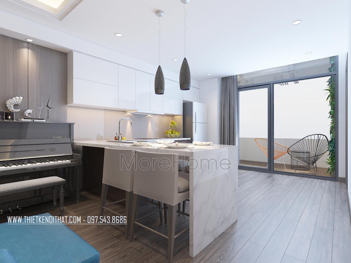Thiết kế nội thất bếp đặt ngay cạnh không gian phòng khách. Với thiết kế phong cách hiện đại, trẻ trung, khu bếp gây ấn tượng với gia chủ bởi tone màu trắng tinh khôi. Tuy diện tích sử dụng không quá rộng nhưng ta dễ dàng nhận thấy, không gian mở, thiết kế cạnh cửa sân trời hướng ánh sáng là những yếu tố thiết yếu giúp không gian bừng sáng. Từ đó, thiết kế bếp đơn thuần khá hẹp và tù túng trở nên mới lạ và sáng hơn rất nhiều.