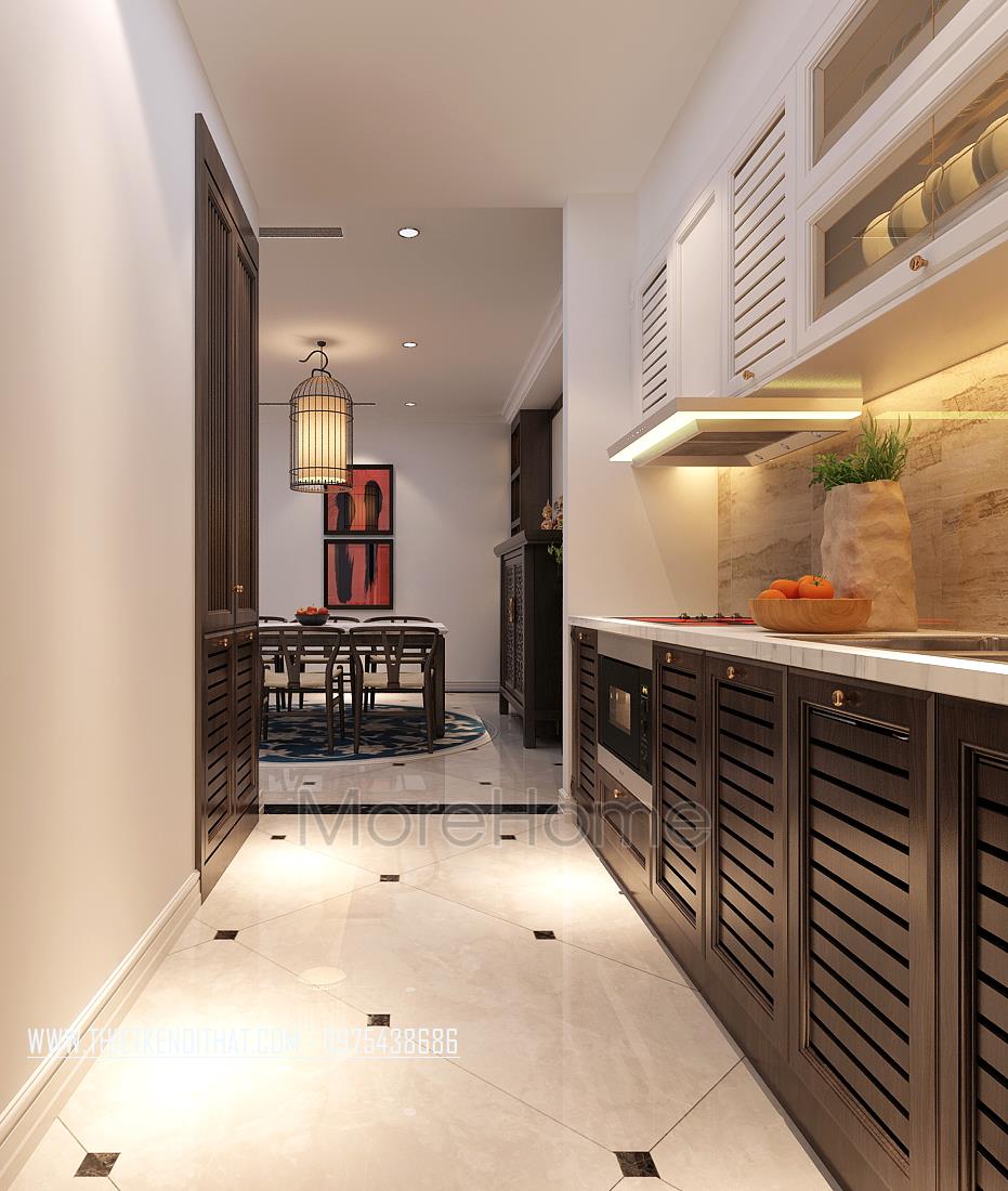 Cùng một không gian sinh hoạt chung bàn ăn được bố trí liền kề ngay cạnh đó với bộ bàn ghế gỗ tự nhiên với những đường cong cách điệu tinh tế, chỗ tựa ôm lưng khá thoải mái, ghế ăn có tay vịn. Phòng bếp được thiết kế lùi vào trong tách biệt với phòng khách và phòng ăn, hệ thống tủ bếp với tủ trên và tủ dưới máy hút mùi được lắp ngay trên bếp nấu đảm bảo không gian thông thoáng cho phòng bếp.
