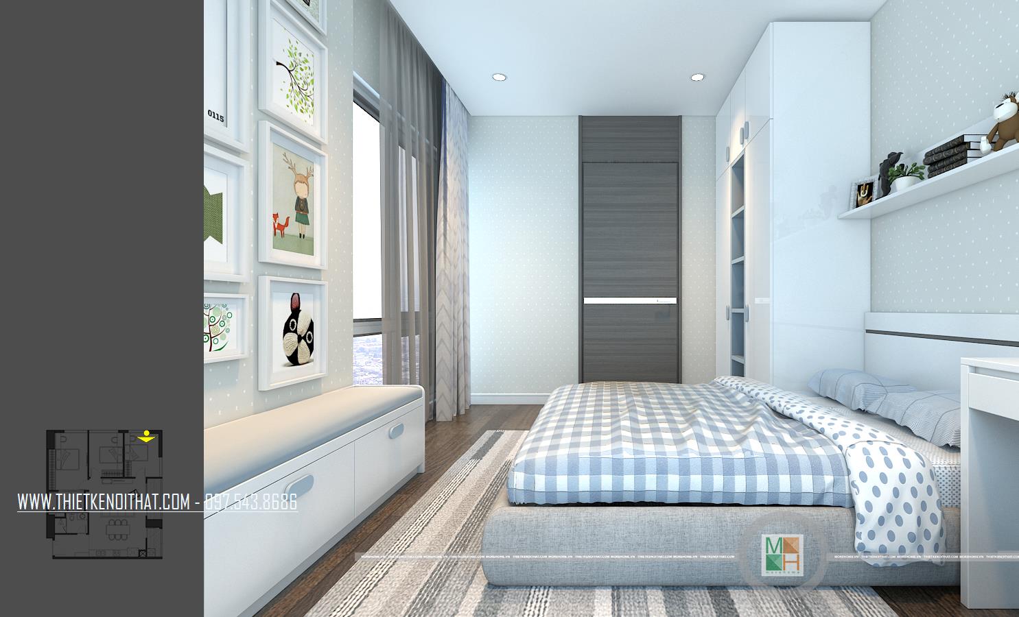 Thiết kế nội thất phòng ngủ trẻ em với 2 phòng, một phòng ngủ bé trai với tông màu xanh nhẹ nhàng và một phòng ngủ bé gái với tông màu hồng đáng yêu. Phòng ngủ bé trai có diện tích rộng hơn nên được bố trí thêm một chiếc kệ tủ trang trí, bàn học của 2 bé đều được đặt cạnh cửa sổ tạo môi trường tốt nhất cho các bé học tập.