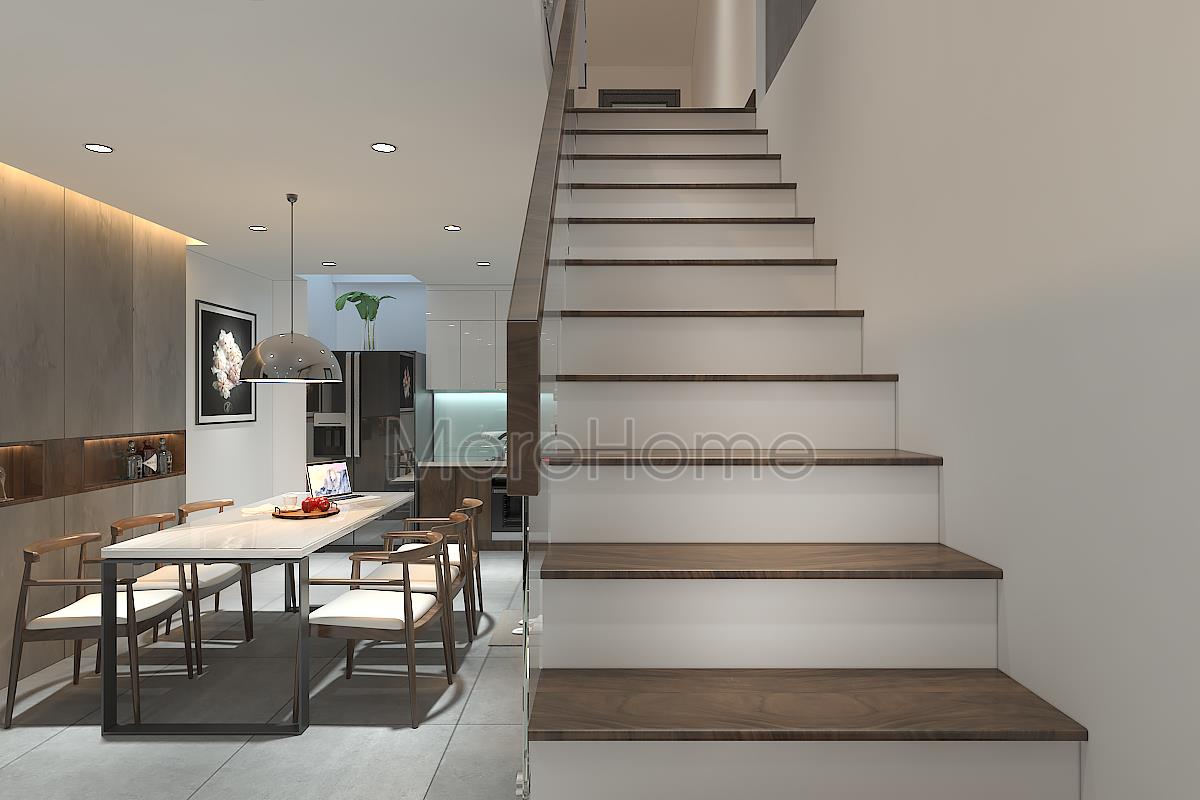 Bên cạnh đó là lối lên cầu thang để đến không gian sinh hoạt tại phòng khách của ngôi nhà ống hiện đại 4 tầng mặt phố An Dương.