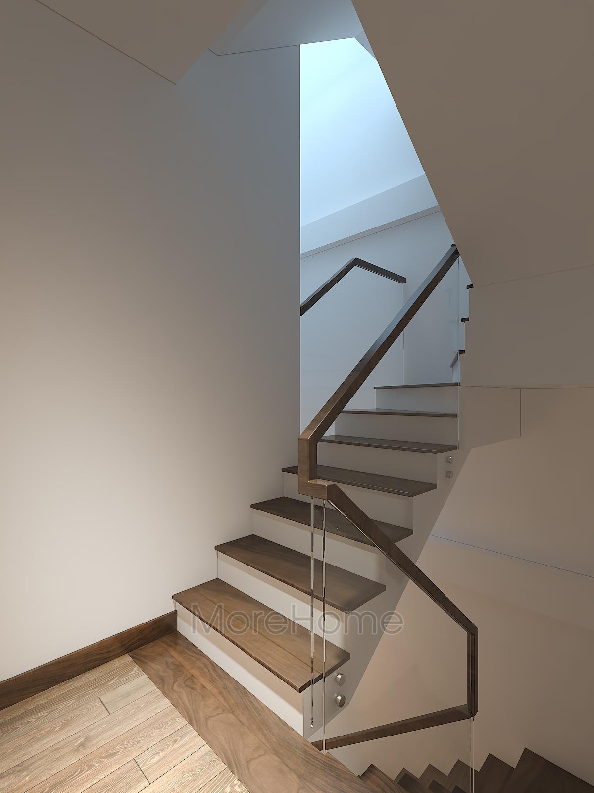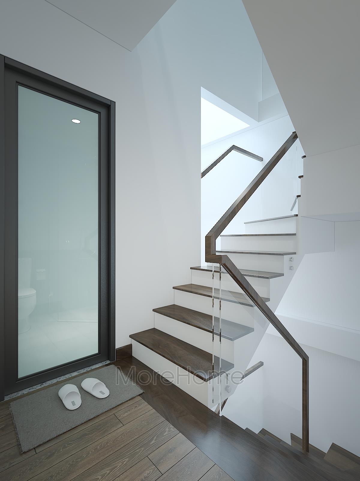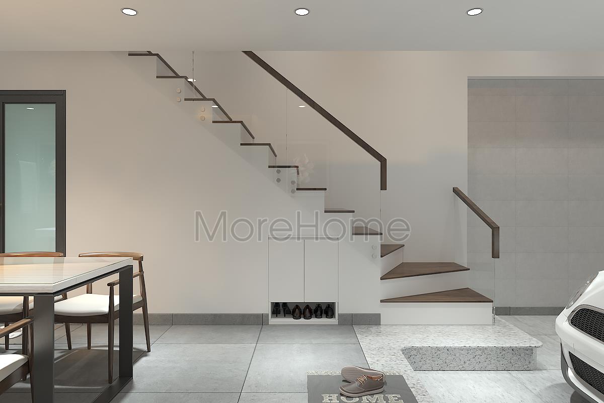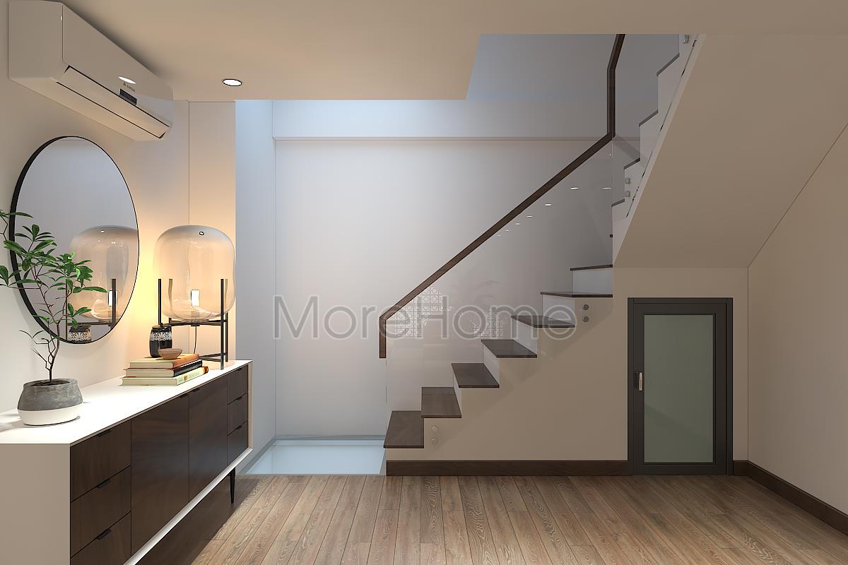 KTS Morehome tận dụng khoảng không gian bức tường cầu thang làm khu vực trang trí và lắp đặt tivi cho gia đình gia chủ. Chúng tôi đã tính toán cẩn thận để chiếc tivi được treo đúng với tầm nhìn của mọi thành viên trong gia đình mà không bị vướng hay che khuất bởi lan can cầu thang.