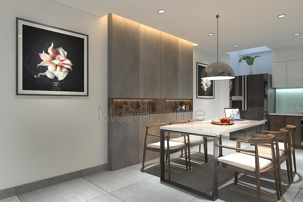 Để tôn lên vẻ đẹp tổng thể của ngôi nhà ống hiện đại, kiến trúc sư Morehome thiết kế nội thất nhà ống theo từng không gian. Phòng ăn và phòng bếp được thiết kế chung không gian với khu vực để xe ở tầng 1.