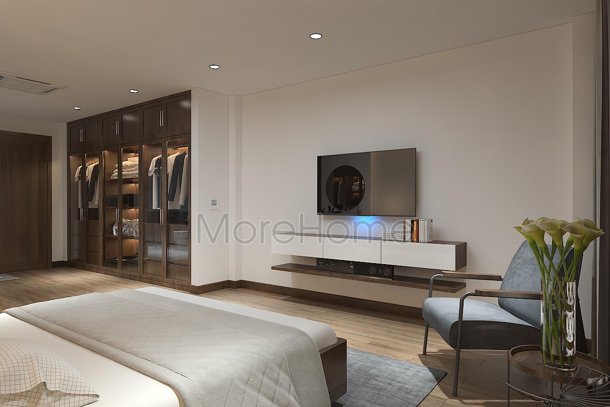 Phía đối diện chiếc giường ngủ hiện đại là khu vực kệ tivi đơn giản treo tường màu trắng. Một chiếc tủ quần áo 3 ngăn 6 cánh với kính cao cấp. Một chiếc ghế sofa nỉ, một lọ hoa tươi đầy sức sống, tất cả đã nâng đỡ cho nhau để tạo ra một không gian phòng ngủ đầy tiện nghi và lãng mạn.