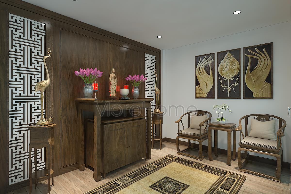Tầng 4 của mẫu thiết kế nội thất nhà ống mặt phố An Dương được dành để thiết kế phòng thờ phật cho gia chủ. Một nơi thanh tịnh, yên bình và thiêng liêng nhất bởi đây là nơi mà gia chủ thể hiện sự tôn kính và tưởng nhớ tới những người đã khuất. Chiếc bàn thờ phật hiện đại bằng gỗ sồi phun sơn cùng bộ bàn ghế đời Minh khiến cho không gian phòng thờ thêm ấn tượng và tâm linh hơn rất nhiều. Bức tranh bàn tay phật cùng những chú hạc, bình hoa sen đều là những đồ vật trang trí tâm linh nhất mà Morehome gợi ý cho gia chủ.