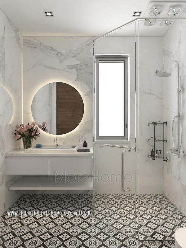 Thu hút ấn tượng nhất cho phòng tắm là mẫu gạch lát sàn họa tiết đen trắng kết hợp đá ốp tường màu trắng vân mây độc đáo