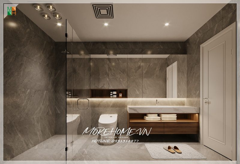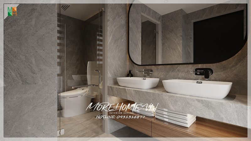 Thiết kế phòng tắm với nội thất nhẹ từ đá, kính cường lực tạo nên không gian thoáng mát và rộng rãi hơn