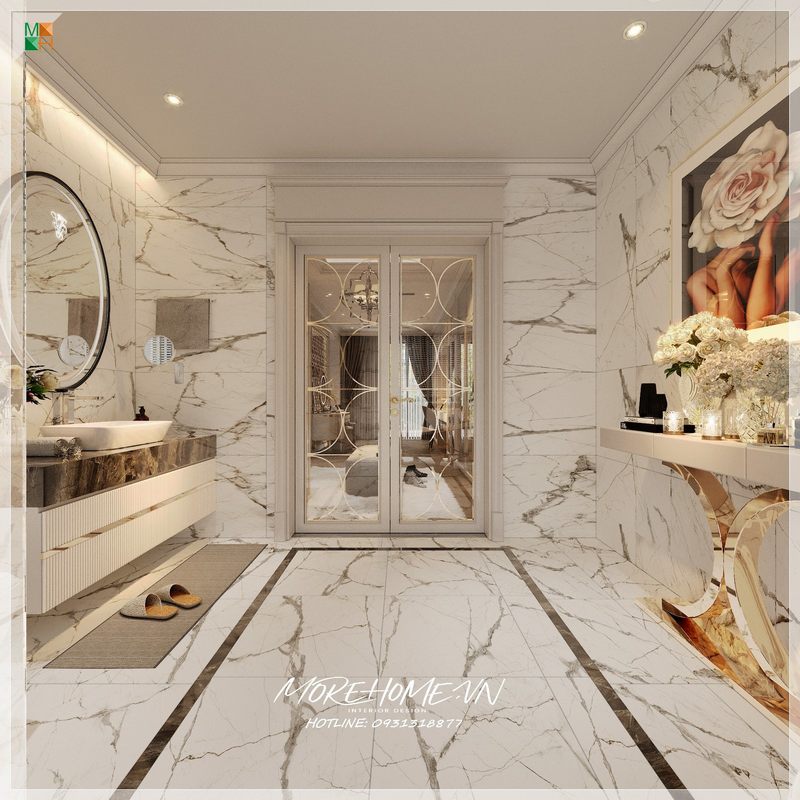 Sư dụng đá ốp tường phòng tắm màu trắng với đường vân loang ấn tượng tạo điểm nhấn nổi bật cho không gian phòng tắm biệt thự