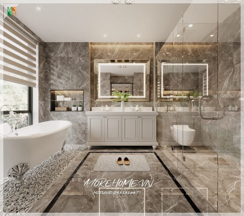 Phòng tắm lớn của biệt thự, nhà phố sử dụng đá lát nền và ốp tường có màu sắc tương phản độc đáo và sang trọng, trẻ trung.