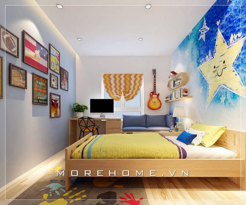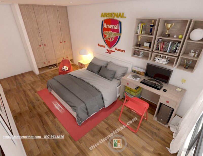 Thiết kế phòng ngủ bé trai hiện đại, nội thất được sắp xếp hợp lí, bàn học được bố trí cạnh cửa sổ giúp con tập trung học bài
