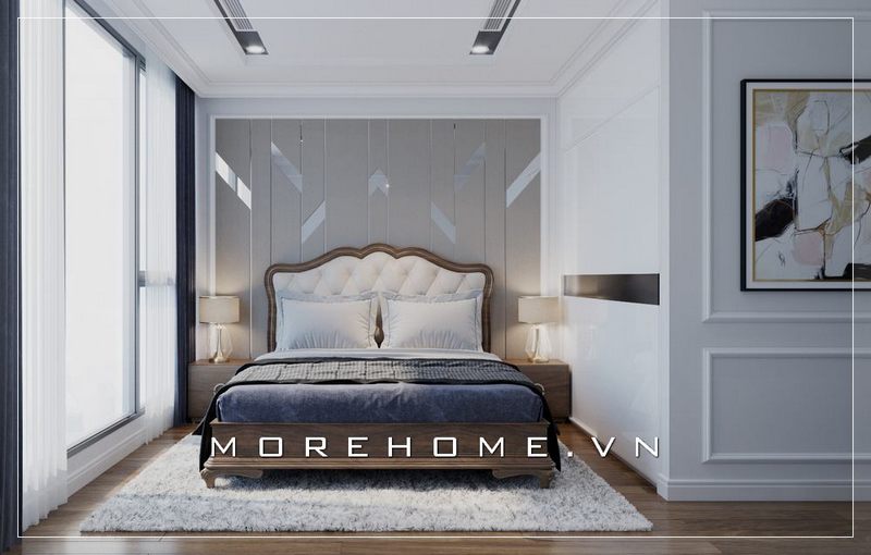 Giường ngủ gỗ óc chó bọc nệm trắng kết hợp đường nét uốn lượn tạo nên điểm nhấn ấn tượng cho phòng ngủ tân cổ điển sang trọng, quý phái.