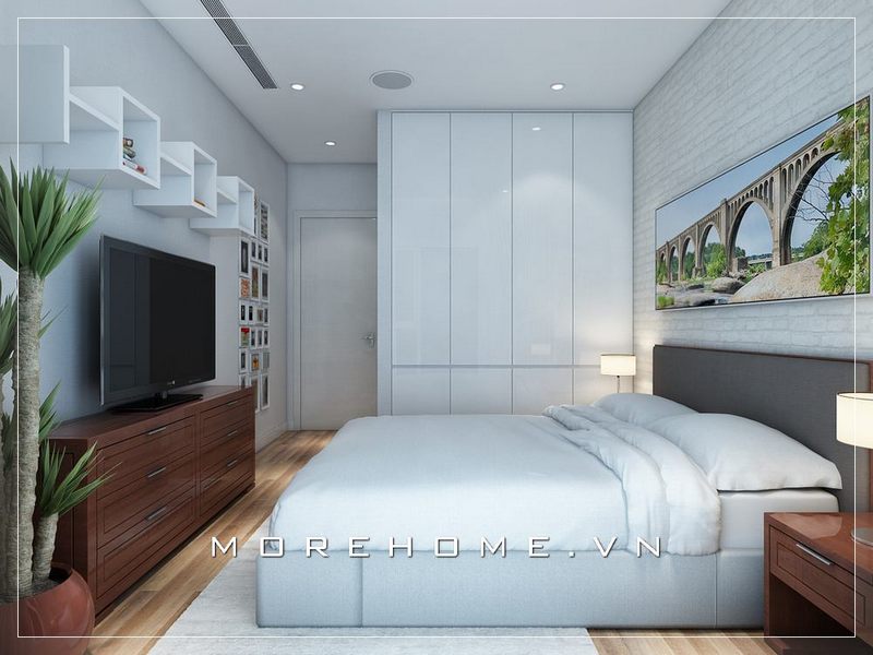 Nội thất phòng ngủ chung cư hiện đại, giường ngủ bọc da dạng thấp, kệ ti vi treo tường... mang lại không gian nghỉ ngơi thư thái và rộng thoáng hơn