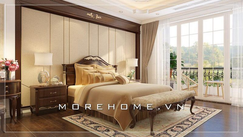 Nội thất phòng ngủ gỗ tự nhiên sang trọng và đẳng cấp, phần cửa hướng ra ban công được gia chủ lựa chọn với chất liệu kính cường lực an toàn tạo sự mềm mại và sinh động hơn
