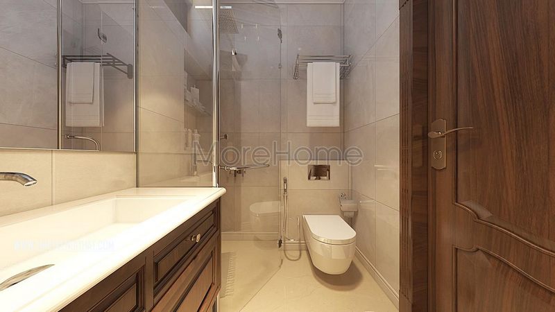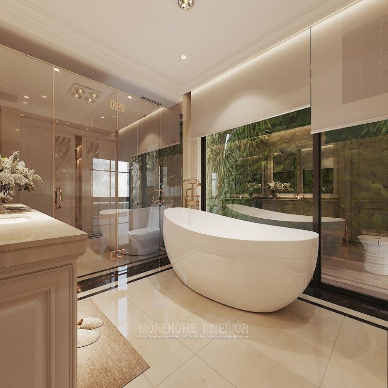 Vách tắm kính 180 độ ngăn giữa khu vực phòng tắm đứng và nhà vệ sinh giảm thiểu sự ướt át của phòng tắm gây ra mang lại sự thoải mái nhất cho gia chủ khi sử dụng phòng.