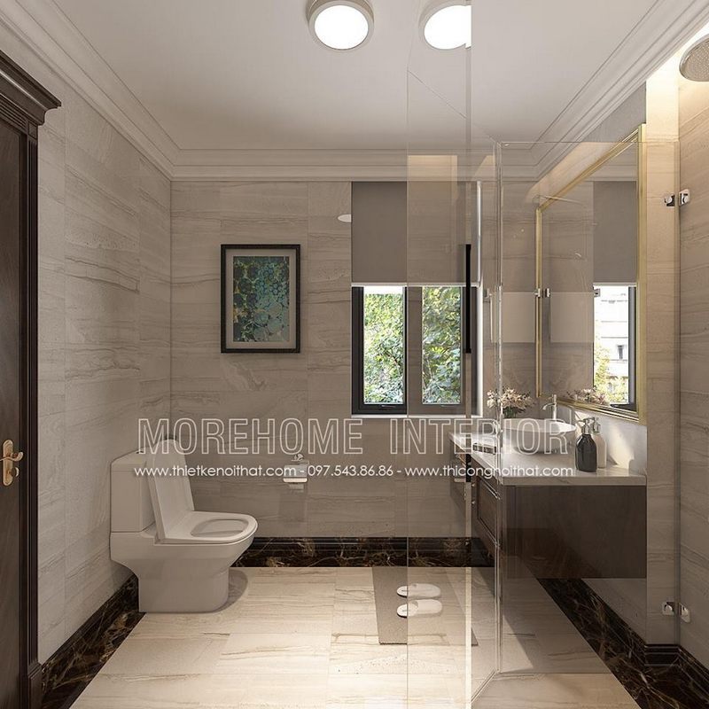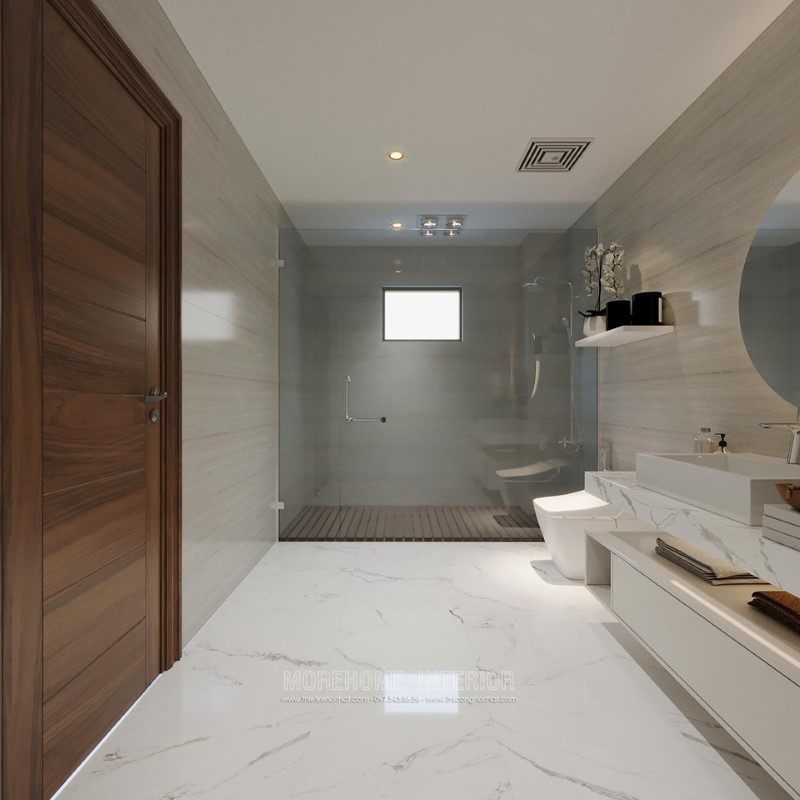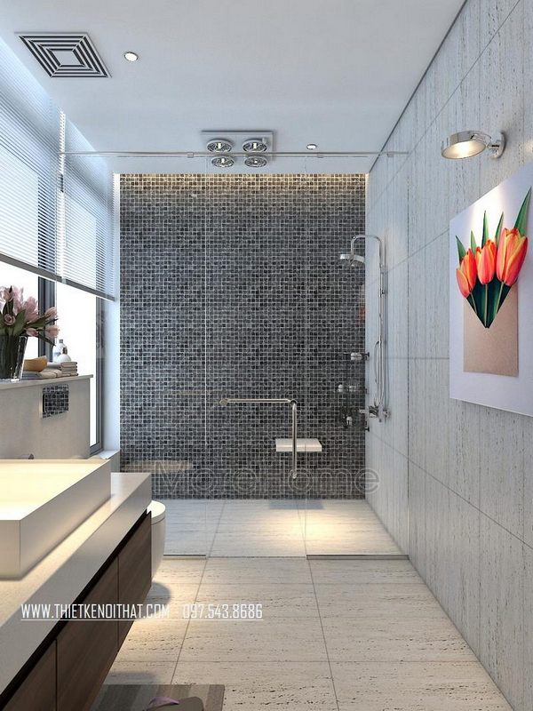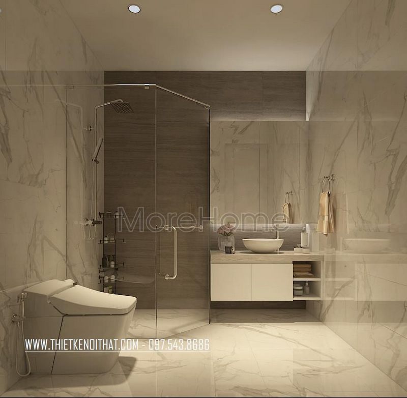 Phòng tắm hiện đại không thể thiếu đá ốp tường và kính ngăn đem lại sự tiện nghi, cao cấp cho toàn bộ không gian.