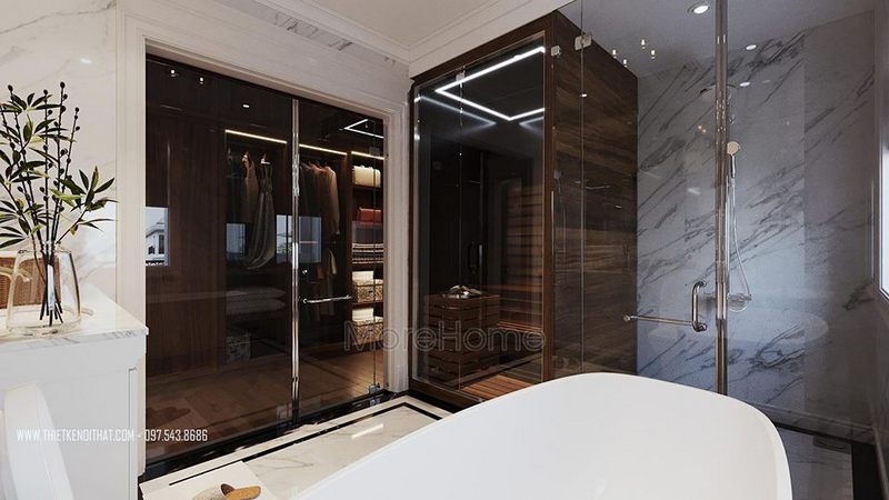 Không gian phòng tắm thiết kế kết hợp có phòng xông hơi mang tới cho người dùng nhiều tiện ích.