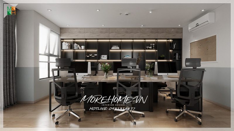 Bàn làm việc có diện tích rộng và phong cách hiện đại bằng gỗ mang lại sự thoải mái cho nhân viên.