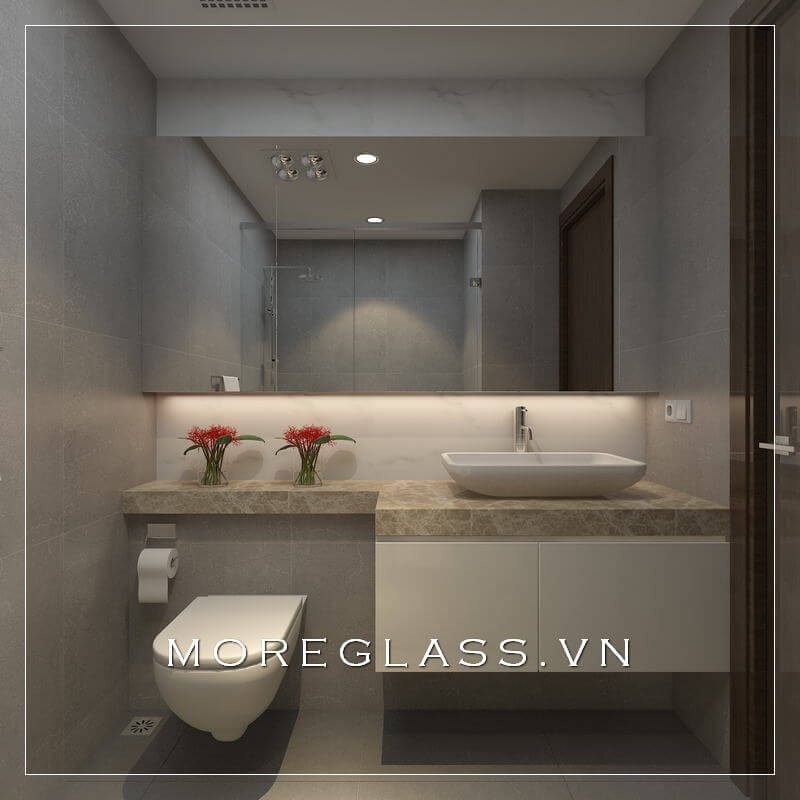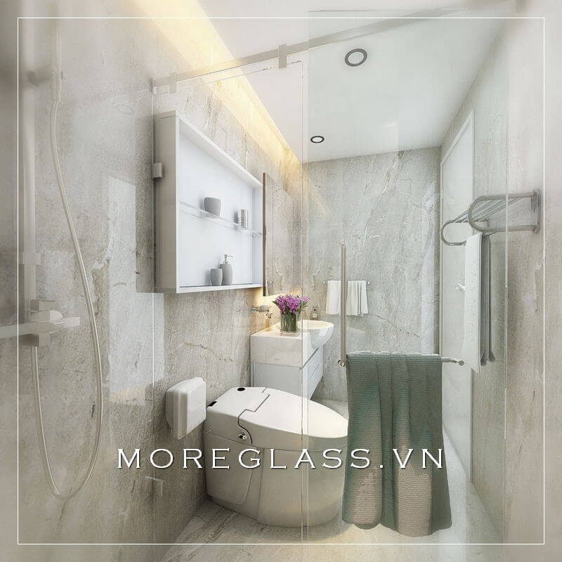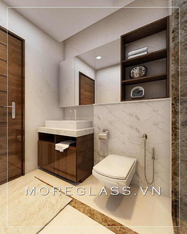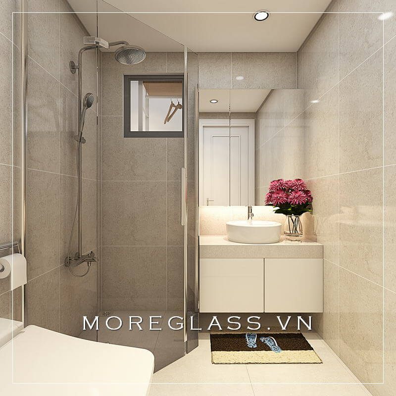 Thiết kế nhà vệ sinh có kích thước nhỏ gọn, với một phòng tắm kính đẹp được bố trí ở một góc nhỏ của phòng tắm.