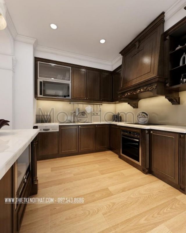 Mẫu tủ bếp gỗ óc chó cung cấp cho gia chủ một không gian nấu nướng tiện lợi và dễ chịu nhất.