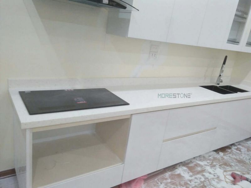 Ấn tượng mẫu thi công nội thất bếp ốp đá Himacs màu vàng ngà rất sang trọng dành cho không gian bếp chung cư, nhà phố, biệt thự.