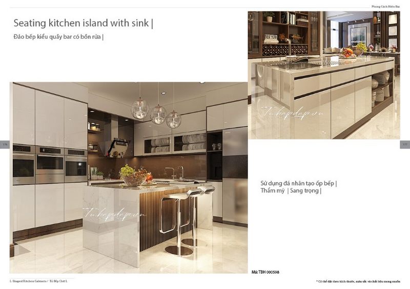 Gia chủ thường lựa chọn đá nhân tạo khi thiết kế phòng bếp theo phong cách hiện đại vì nó có nhiều lợi ích: độ bền cao, chịu nhiệt tốt, thẩm mỹ và đa dạng hóa trong các sản phẩm từ bàn đảo, mặt bàn bếp đến sàn nhà.