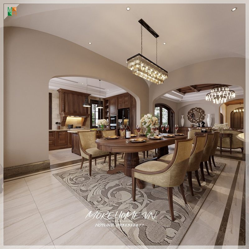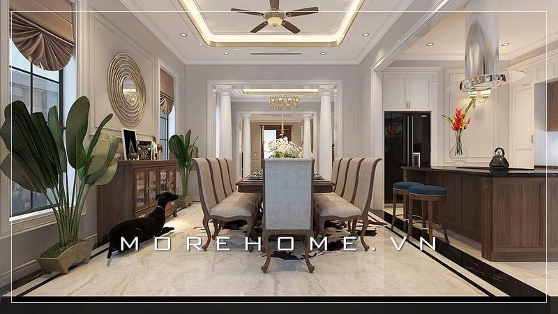 Tạo ra một không gian thẩm mỹ cao bằng cách thiết kế nội thất phòng ăn với phong cách tân cổ điển đường cong uyển chuyển mềm mại sẽ giúp gia chủ cảm nhận được sự thoải mái dễ chịu nhất.
